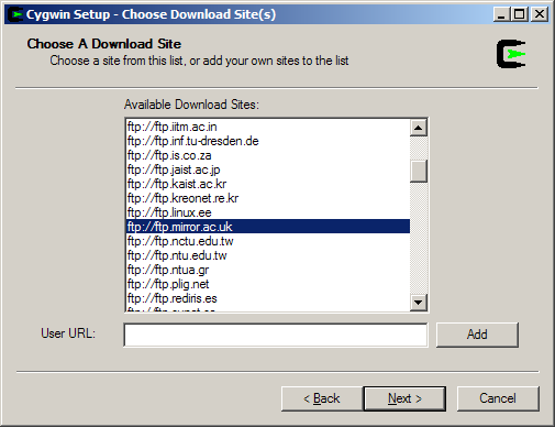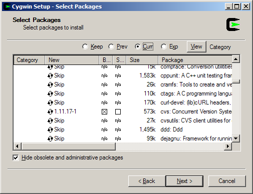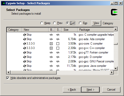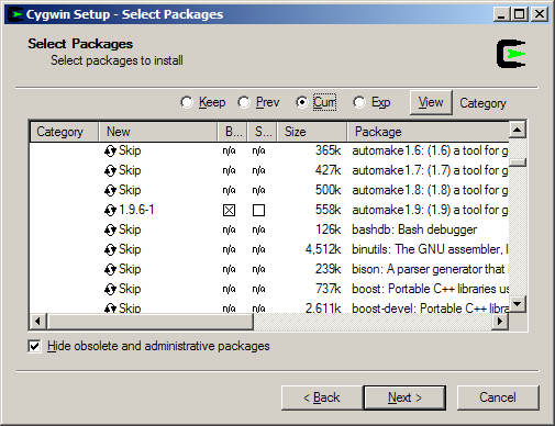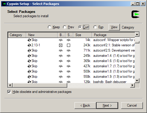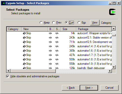 The following dialogue box will eventually be displayed.? Use this dialogue to choose which Cygwin packages to install.