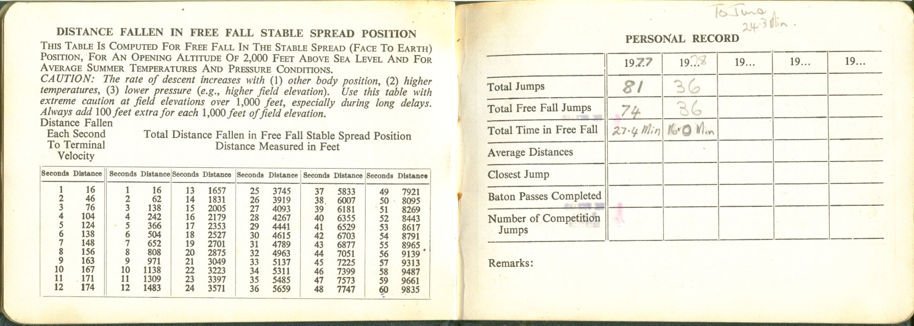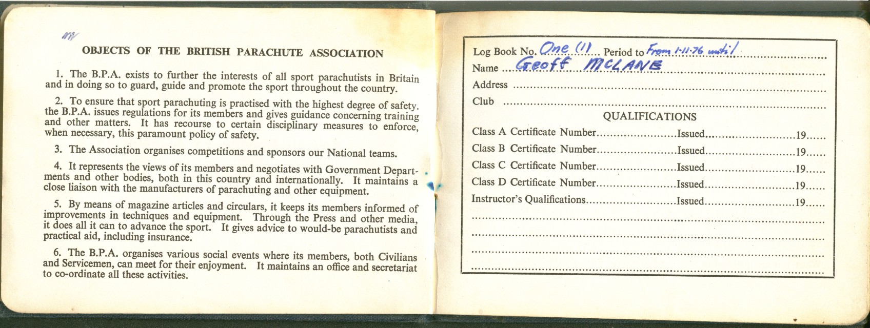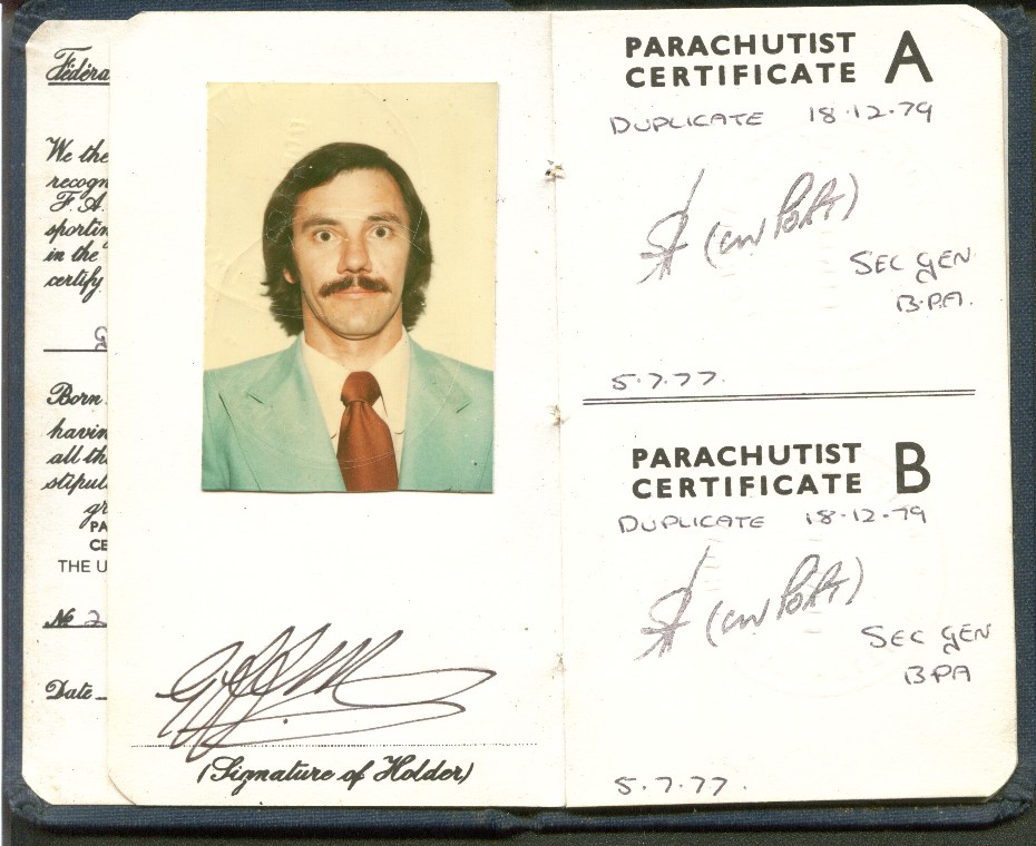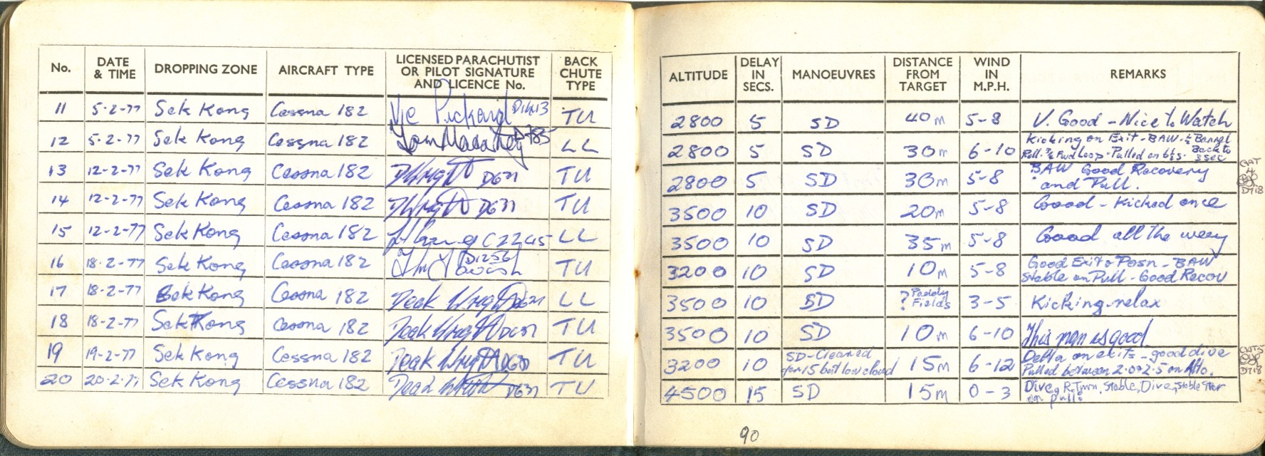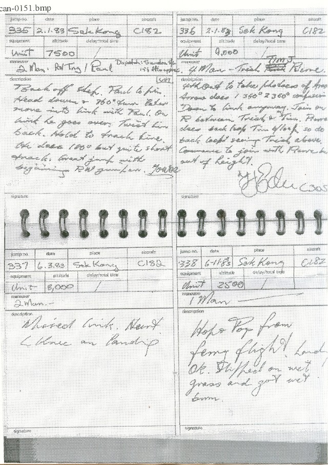 I took to this, like a duck to water ;=)) I went far enough to become an instructor, so I could teach other people this fantastic sport ... Below is a scan of my BPA certificate, and many pages from the first log book ... first 200 jumps ... and just some b/w scans out of my next book ... this show 338 jumps ... I guess I did a total of 350-360 ... before I moved onto other sports ...