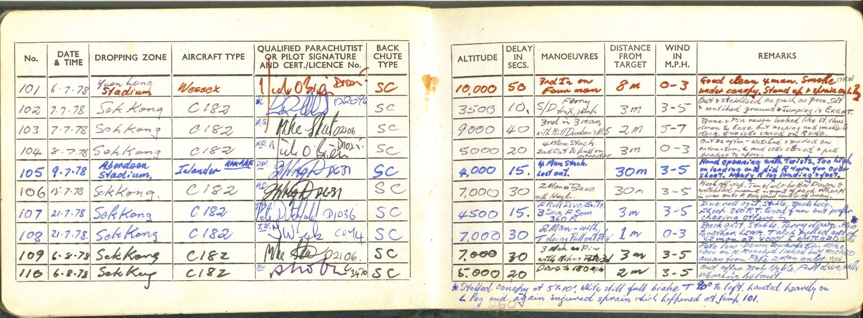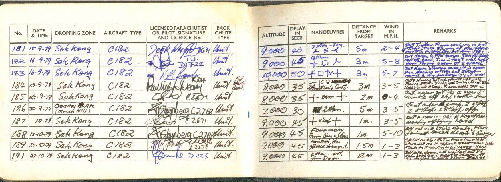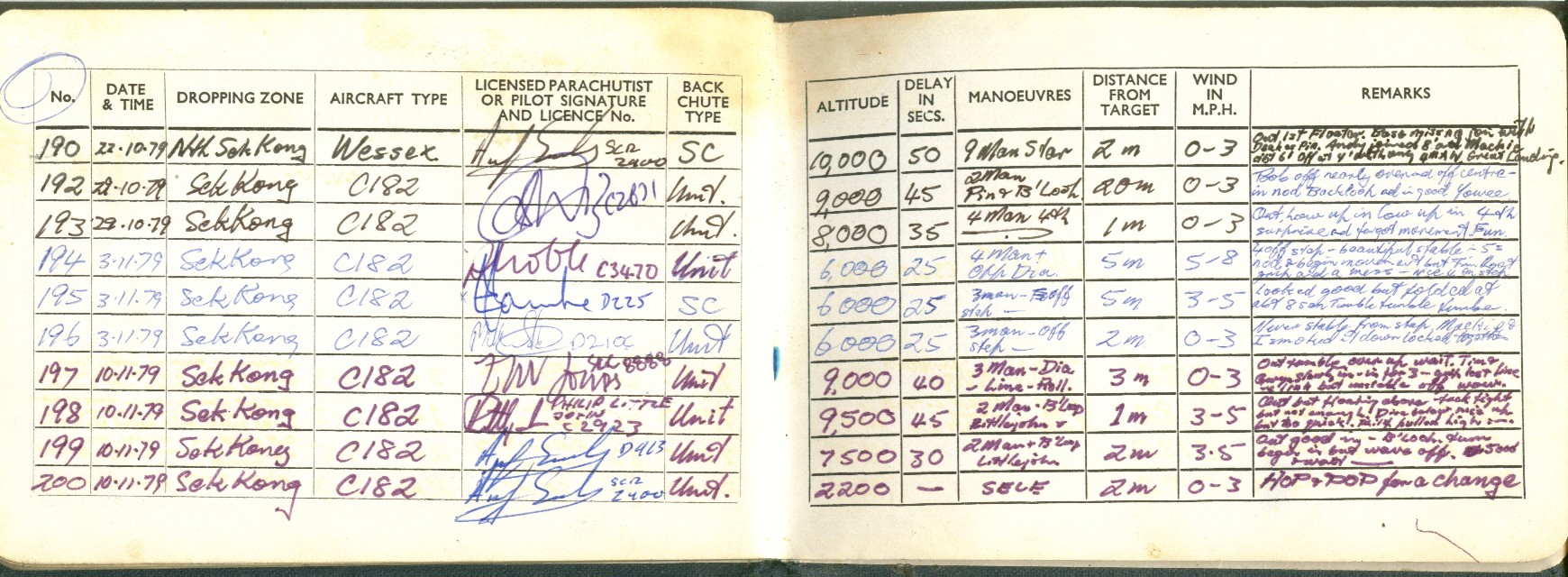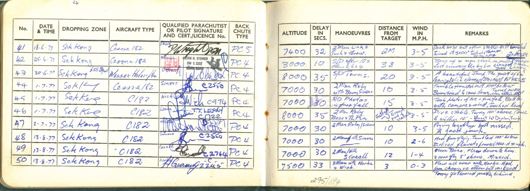 I took to this, like a duck to water ;=)) I went far enough to become an instructor, so I could teach other people this fantastic sport ... Below is a scan of my BPA certificate, and many pages from the first log book ... first 200 jumps ... and just some b/w scans out of my next book ... this show 338 jumps ... I guess I did a total of 350-360 ... before I moved onto other sports ...