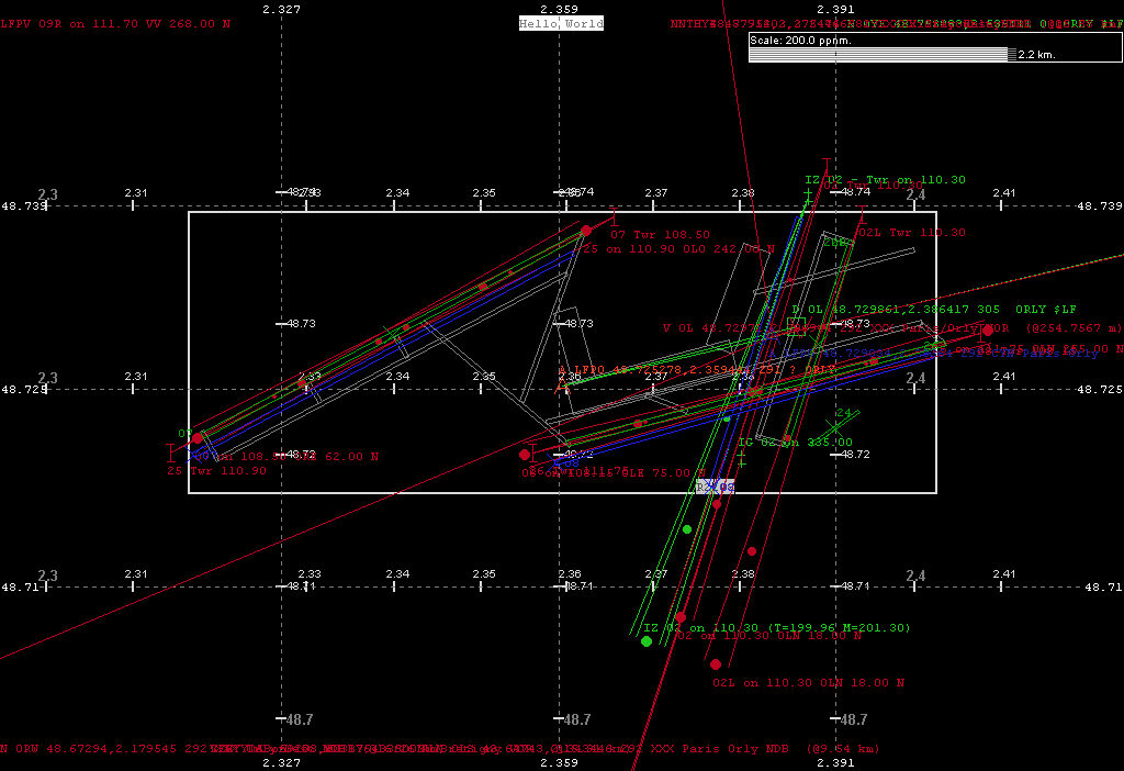 This is the graphic output of my fgsd (FG Show Data) tool, set at a scale of 300 pixels per n. mile. DAFIF data has 'blue-lights' around its runways, 'green' ILS and navaids, with matching coloured text. While the FG data, runways are 'green', ILS/NavAid 'red', and taxiways in 'gray', etc. The white rectangle is a border formed from the DAFIFT runways.