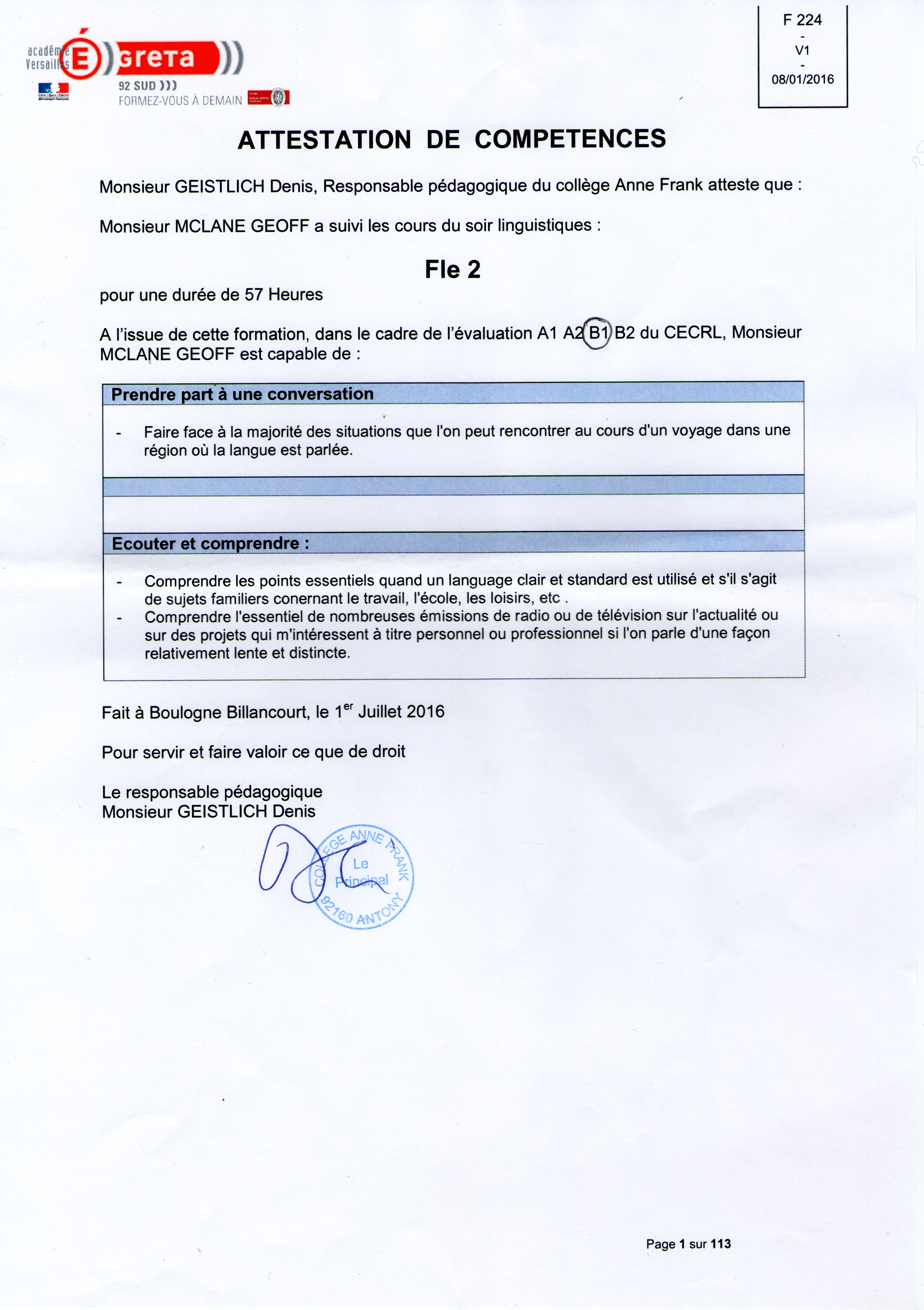 Learning spoken and written french. Centainly not one of my greatest feats, but way up there in difficulty. Last year I attended a Grata course, for about 60 hours, at entry level 1, and this year, in July 2016, completed another 57 hours of the level 2 course, both at the Middle School Ann Frank, in Antony.