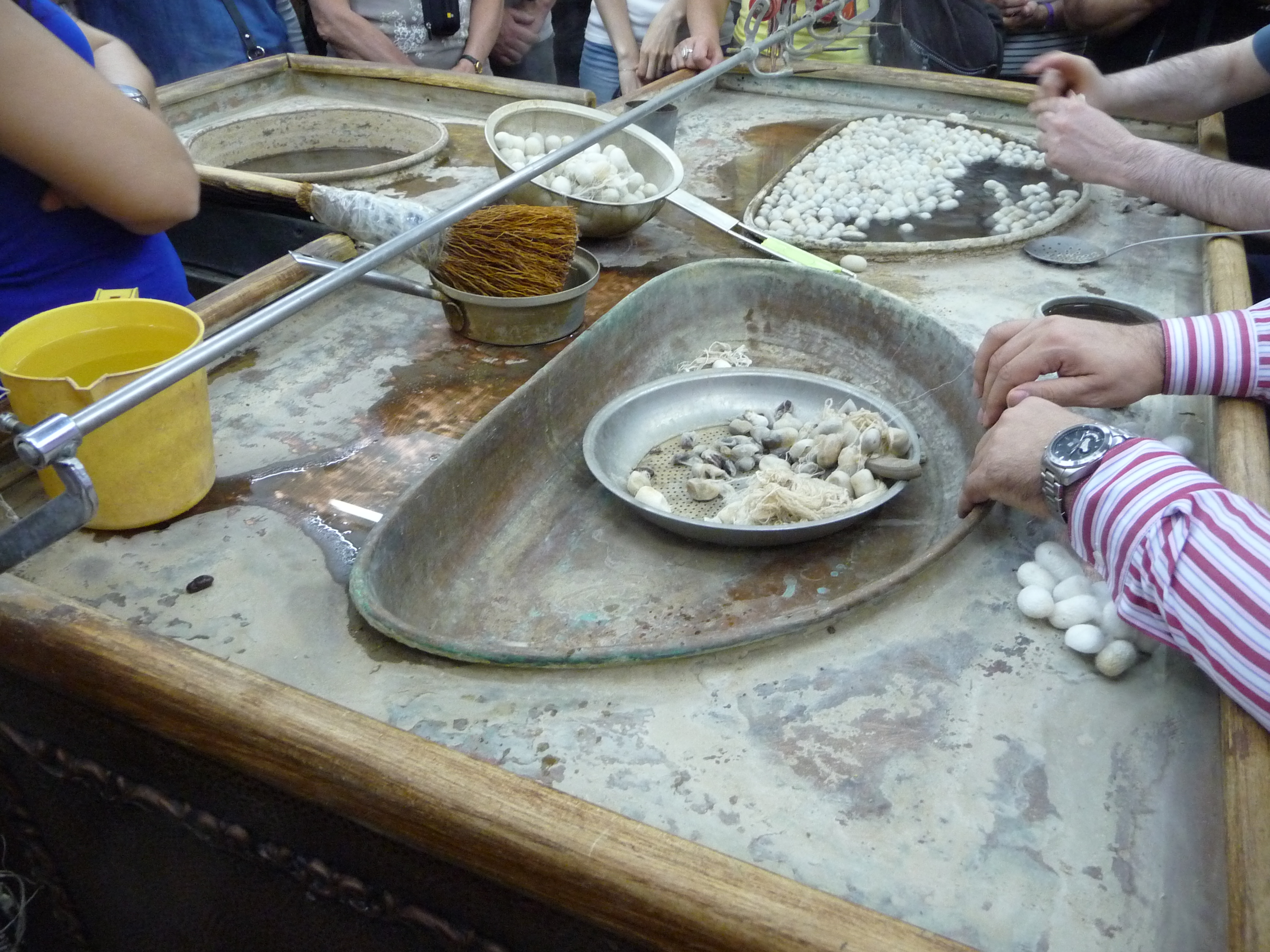 Next was a visit to a carpet weaving factory, [2], where the movements of the weavers hands are too fast to see. The strand is taken around the back of two vertical strands, formed into a double knot, and cut, all in it seems less than a second. As well as wool the carpets can be woven from silk, [2], thanks to the cocoon built by the little silk worms.